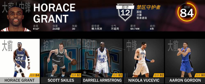替补:拉沙德-刘易斯(87)、尼克-安德森(85)、贾马尔-尼尔森(85)、史蒂夫-弗朗西斯(84)、丹尼斯-斯科特(84)、霍里思-格兰特(84)、斯科特-斯凯尔斯(83)、达里尔-阿姆斯特朗(82)、尼古拉-武切维奇(82)、阿隆-戈登(80)