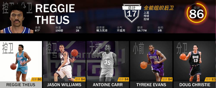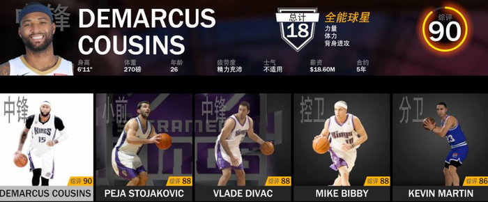 替补:内特-阿奇巴尔德(94)、德马库斯-考辛斯(90)、弗拉迪-迪瓦茨(88)、迈克-毕比(88)、凯文-马丁(86)、雷杰-瑟乌斯(86)、杰森-威廉姆斯(84)、安托万-卡尔(84)、泰瑞克-埃文斯(84)、道格-克里斯蒂(83)