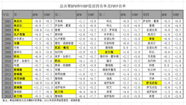 这是我整理的从2001年至今,总决赛两队BPM和VORP值的前四名,以及FMVP获得者的球员表格。