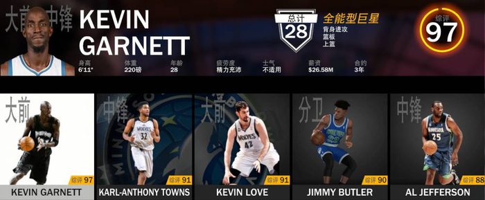 中锋:凯文-加内特 能力值97