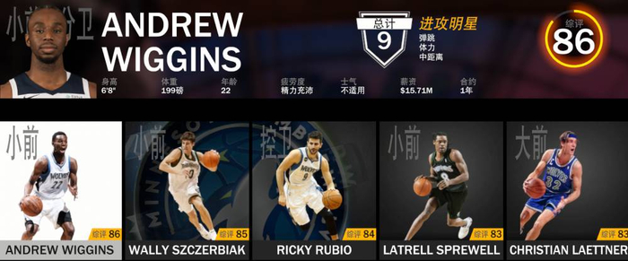 替补:唐斯(91)、巴特勒(90)、艾尔-杰弗森(88)、史蒂芬-马布里(87)、特里尔-布兰登(86)、伊塞亚-莱德尔(86)、维金斯(86)、卢比奥(84)、拉特里尔-斯普雷维尔(83)、克里斯蒂安-莱特纳(83)