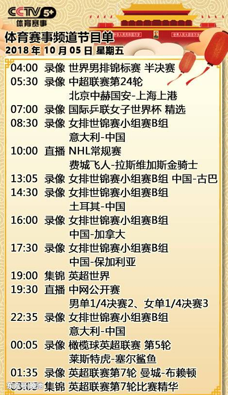 中央广播电视总台体育频道(CCTV5)和体育赛事频道(CCTV5+)已经公布了2018年10月5日的最新节目单。虽然世界女排锦标赛在小组赛结束后暂时告一段落,但中超联赛再次让路,CCTV5将在黄金时间直播NBA中国赛上海站的比赛,CCTV5+继续直播中网公开赛。