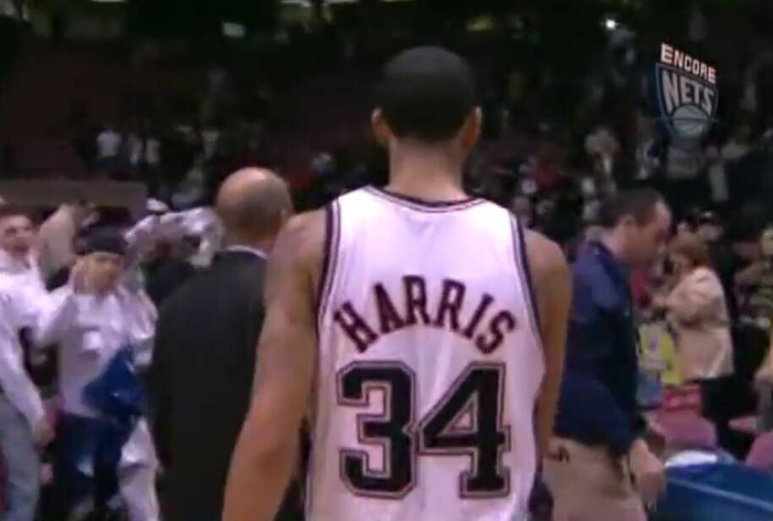 在命中这记半场三分之后,裁判第一时间没有吹罚有效,在经过数分钟的录像回放之后确定进球有效,哈里斯和队友们一起庆祝胜利!
