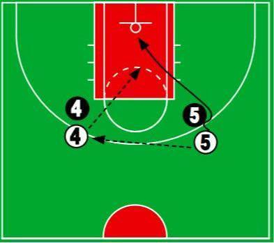 如下图,进攻球员5号将球传给4号后,果断迅速摆脱防守向篮下切入,横切至篮底,预备接4号的回传球,4号队员待5号队员摆脱防守队员后,立即回传球给5号进攻队员上篮。