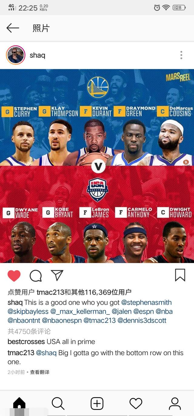 这个问题瞬间引起了球迷的热烈讨论,而前NBA得分王麦迪在下面留言:“这个问题,我选择下面一组(梦八)。”