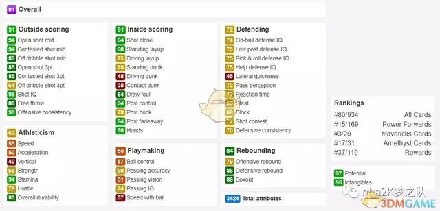 OK,前戏过后进入正题,相信这张司机一定是很多朋友在紫宝石级别的首选,除了他自身实力之外,其人气也是很重要的原因(紫宝石里面人气高的球员很少)。这张紫司机拥有非常丰富的“武器库”,中投高达94点,搭配上同样94的后仰和背打能力,将大幅提升他“金鸡独立”的命中率,所以司机应该是目前背身投篮能力最强的大前锋。此外,85的三分也能让司机投中很多空位三分,不过他的出手速度偏慢,需要适应。鉴于2K19电脑在防守挡拆外弹时经常会留给大个子空位机会,所以一名会投三分的内线也将有助你通关称霸赛,如果还没有换到司机的话,可以用蓝乐福或红波神来代替。