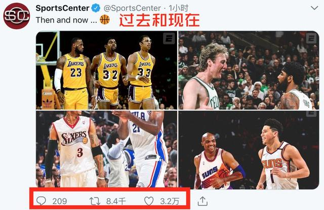 NBA常规赛开赛在即,美国媒体SportsCenter在社交媒体上传了一组NBA传奇巨星和现役球星的ps合照,上传不到60分钟便引来不少球迷热烈讨论,一共获得3.2万个球迷的集体点赞。配文内容:过去与现在。(详细见文章配图)