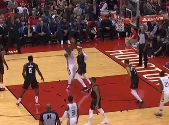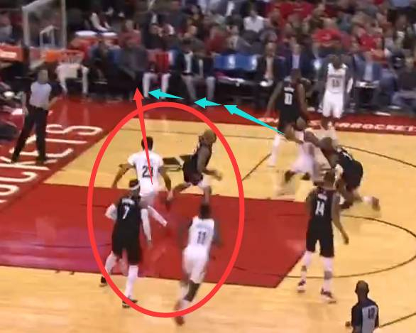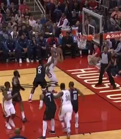 这是下半场鹈鹕的第一次进攻,不知道是不是歇大了的缘故,好不容易开始包夹的火箭队员再一次眼神看着兰德尔再非常深的位置作势要单吃格林。
