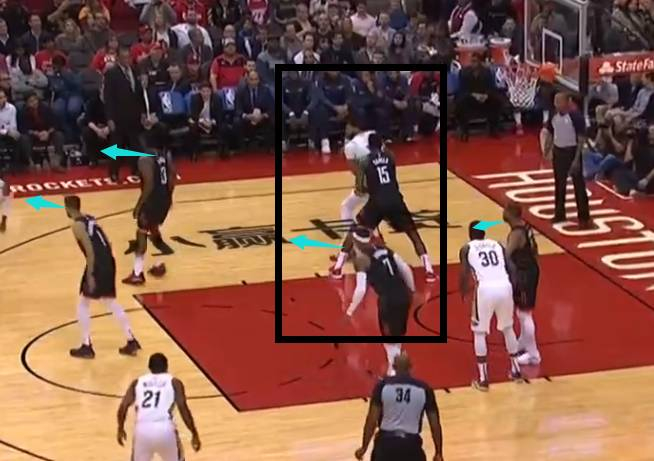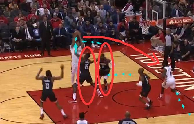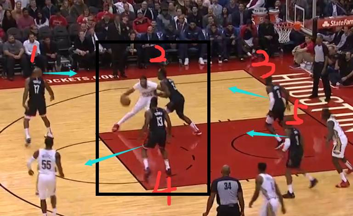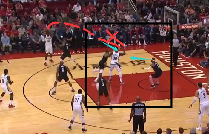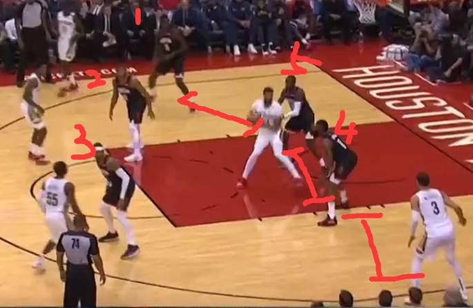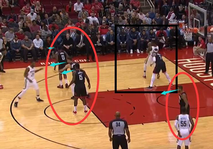 浓眉接球的那一刻起,火箭队球员的关注点依旧不是浓眉!而是注意在给浓眉传球的传球者,放任浓眉低位去单打卡佩拉,之前的那一次进攻,很明显可以感觉到他要单防浓眉已经有点吃力了,火箭的其他队员仍然没有上去包夹。