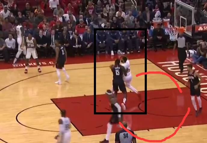 在被鹈鹕连凿三四个以后,火箭似乎还是没有打算做出防守策略的改变,不包夹坚决不包夹,这次在篮下很深的位置要位的从浓眉换成了兰德尔。火箭依旧决定让安东尼继续单防对面的内线。