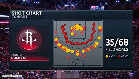 他们本场得到了76分,总共投进了20个三分球,而本场比赛火箭队的命中点数如上图所示,可以很明确的看出,火箭队的进攻只有2个地方,要么是篮下3秒区内,要么是3分线外,这也正是火箭队的打法,上赛季他们就是靠这种打法拿到了联盟第一的成绩。这张图完全展示了火箭队的战术打法,也说明了安东尼的问题。