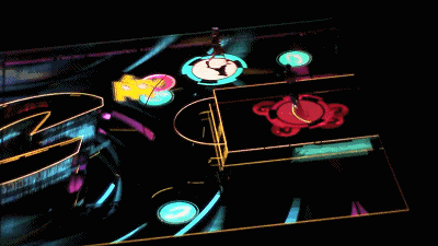 他们利用3D投影映射系统,在全场为球员们提供了一次面对面交锋的机会。地面让人眼花缭乱的投影内容会跟着队员的行进和跳跃作出相应的艺术演示,将运动节奏可视化,艺术化,作为观众的你,根本不会觉得两个人的比赛没有看头,反而是看头太多,偶尔会让你找不到焦点。
