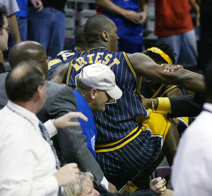 这时有球迷将饮料瓶扔到了阿泰身上,后者被激怒了直接冲上了看台殴打球迷(阿泰认为扔他瓶子的球迷,但是打错人了),斯蒂芬-杰克逊和杰梅因-奥尼尔也去“帮忙”,步行者其他球员也有参与斗殴的,而弗雷德-琼斯冲上看台却被球迷殴打,最后警务人员进场才拉开了打架的人群。