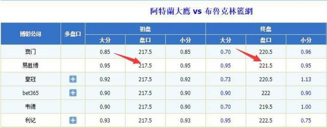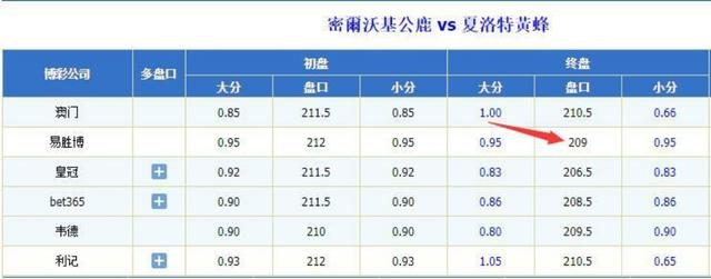 这场比赛易胜博给出了212的初盘,这也是算两队交锋历史上的最大盘口,显然易胜博对最近狂出大分的雄鹿充满信心,后市出现降盘其实更多的是受到雄鹿主场场均得失分只有207以及黄蜂近期小分居多的影响,终盘维持在了209,大小分水位相同,这是利用彩民的诱小分心理作用,全场109-104,两队打出了大分。