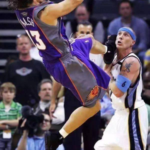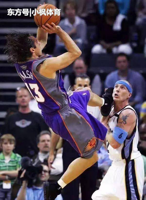 大家都听说过后仰投篮,纳什这个投篮完全可以形容为后躺投篮了。这难度实在是太高了,大家注意纳什的一只脚已经是放在了防守球员白巧克力的肩膀位置了,这让防守人怎么防守啊?只能干看着纳什投篮,进不进全看他自己的感觉了。