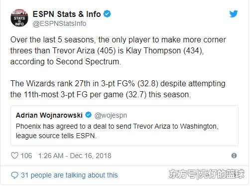 推文:过去五个赛季,只有克莱-汤普森的底角三分命中数(434)高于阿里扎(405)。奇才的三分出手数排在联盟第11(32.7),命中率却只排在第27位(32.8%)。