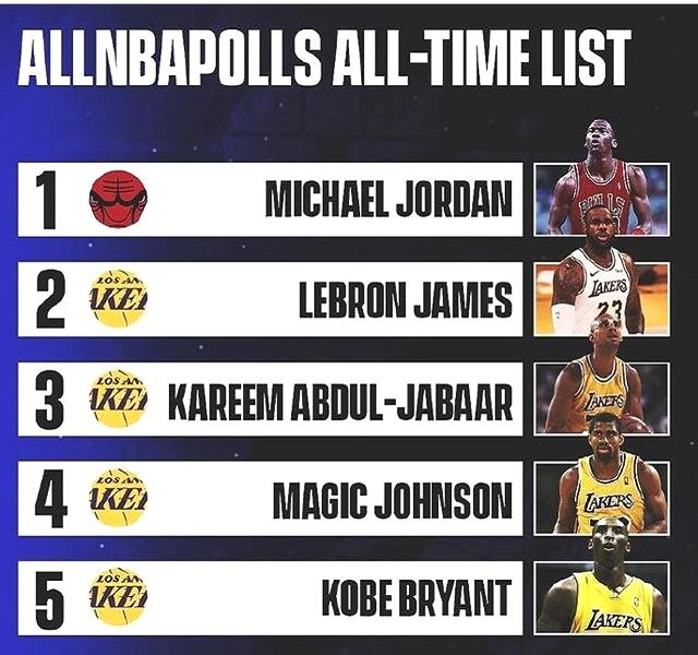 近日,ALLNBAPOLLS也评选了NBA历史上最强的五名球员,其中乔丹稳居第一,无可撼动,值得一提的是除了乔丹之外,其余排在前五名的球员全都来自洛杉矶湖人。其中排在第二的詹姆斯却引发了最大的争议,下面让我们看一看ALLNBAPOLLS评选的NBA历史五大球员。