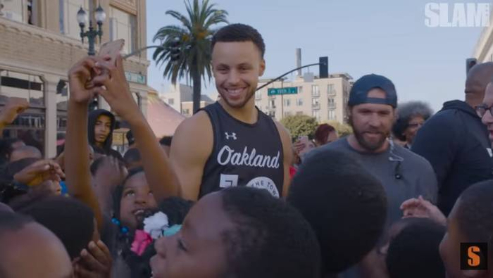 这一天在电报大道福克斯剧院的门口,有150个年轻的孩子们在这里等待库里的到来,他们早就整齐地排好队等待和库里的合影。准备和库里一起合影的还有一些城市里有名的明星(说唱歌手E-40、前世界冠军拳手安德烈-沃德、勇士传奇球员艾尔-阿特尔斯等),这些都是杂志封面拍摄组提前安排好的。库里一从剧院里走了出来,那些早已经等待许久的孩子们就都激动地跑过去了,这让一开始制定好的计划瞬间被打乱了。本来是小个子站在前面大个子在后面,可现在孩子们都挤到一起了。你难以想象当时的场景,库里实在是太受孩子们的欢迎了。有的孩子成功的挤到了前面并拿出手机开始拍摄,后面的孩子只能在后面边看边想办法往里挤。这样的场景一点也不像杂志封面拍摄的场景,反而像是一个歌星的演唱会。