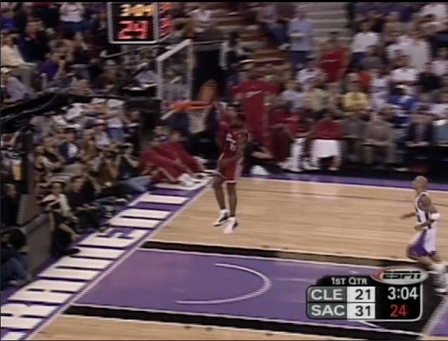詹姆斯的这记扣篮让人看到了乔丹的影子,就像乔丹飞人的那个标志一样,点燃了全场球迷的激情。但随后的一个快攻让人们看到了詹姆斯和他队友的配合。在之后的一次防守中,詹姆斯精准地切下了克里斯蒂的球迅速地奔到了前场,詹姆斯接到了布泽尔的传球快速地向篮筐冲去,詹姆斯看见里基-戴维斯在后面跟进。詹姆斯的这次选择让球迷更加喜欢他了。
