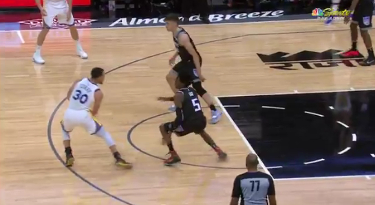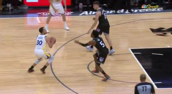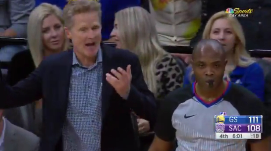 而在比赛第四节,库里的一个动作,却让紧张的比赛节奏中,增添了一丝笑料:这是在第四节还有大约6分钟结束时,勇士111-108领先3分,库里面对福克斯持球单打,然后他后撤步三分出手,但慢动作显示,这个球先是一个小的碎步后撤步,然后又向后了一大步,火眼金睛的裁判当场就吹罚了走步违例,但勇士主帅科尔却对此表示不满,并冲着裁判大声怒吼。
