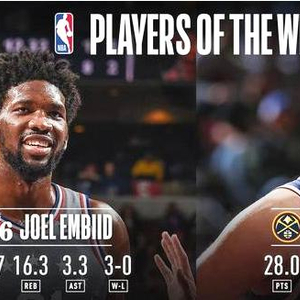 恩比德上周个人场均数据为31.7分、16.3篮板、3.3助攻,率领球队打出3胜0败战绩。本赛季有四场比赛至少拿下40+10的数据和34次两双均是联盟最高。