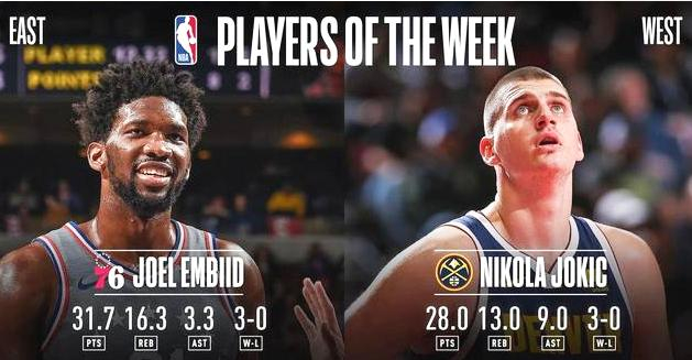 NBA官方公布了上周东西部最佳球员,76人中锋恩比德与掘金中锋纽基奇分别当选上周东西部最佳球员,其中纽基奇为本赛季第2次获得,而恩比德则是本赛季首次获得。