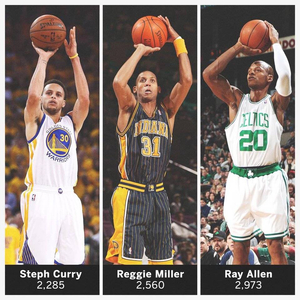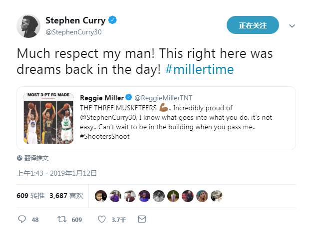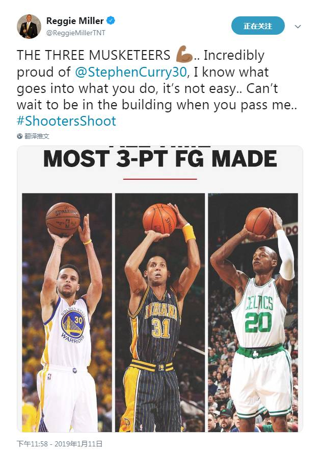 本场比赛后,雷吉-米勒也发推向库里表达了祝贺,米勒在推特上晒出雷-阿伦、自己和库里的对比并写道:三个火枪手[肌肉]……为你感到无比的骄傲@库里,我知道你的所作所为,这绝不是件简单的事……实在迫不及待等到你超越我的那一天……#ShootersShoot(射手就该继续投篮)。