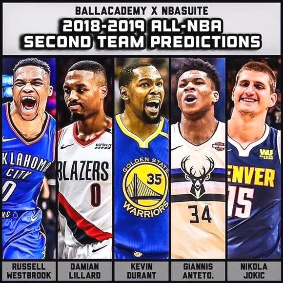 第二阵容,后场维斯布鲁克、利拉德,前场杜兰特、字母哥、约基奇,杜兰特,字母哥竟然掉到第二阵,这个确实有点意思,字母哥是本赛季MVP最大热门,他带领雄鹿拿到联盟最佳战绩,而他的效率值也是联盟最高,怎么说都是联盟最出色的球员,他没有理由进不去一阵。