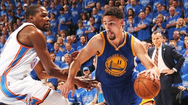 因为15-16赛季勇士在常规赛取得了73胜,所以他们有主场优势,第一场比赛是在甲骨文球馆(2016年5月17日),威少打了40分钟,得到27分6篮板12助攻7次抢断,投篮命中率为33%;杜兰特打了46分钟,得到26分10篮板3助攻3抢断1盖帽,投篮命中率也不高,30投只有10中,命中率为33.3%。虽然威少、杜兰特命中率都不高,但是雷霆以108-102战胜了勇士。