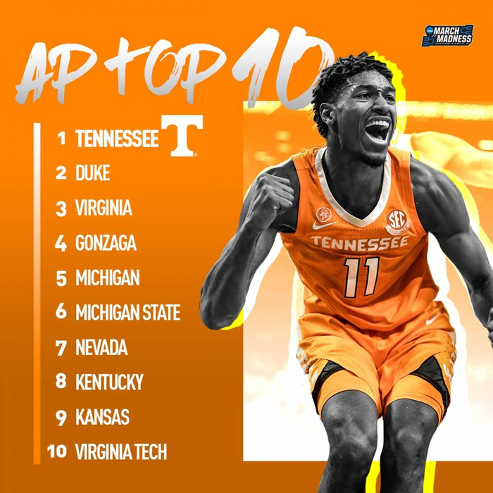 新一周NCAA实力排行前25:田纳西熬出头 ACC双雄紧随其后