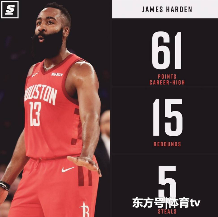1月24日,火箭客场114-110击败尼克斯。哈登疯狂砍下61分15篮板5抢断,哈登61分创生涯新高,哈登61分追平科比在麦迪逊花园广场的历史最高分神迹。登峰造极!哈登到底有多强?