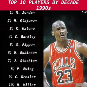第一名无可争议肯定是“篮球之神”乔丹,乔丹对于NBA和篮球的意义都是非常重大的,在90-00这10年间乔丹的统治力是其他球员无法撼动的,排在第二到第十的分别是奥拉朱旺、马龙、巴克利、皮蓬、罗宾逊、斯托克顿、J博士、德雷克斯勒和米勒,这样的排名是非常中肯的,奥拉朱旺是当时联盟的第一中锋,职业生涯两次夺冠。马龙和巴克利都是无冕之王在各自的位置上都是顶尖的球员,马龙也是得分篮板榜上的第一位。