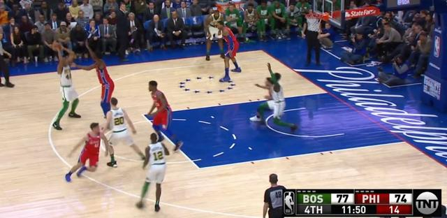 2.霍福德或者泰斯去弧顶带走恩比德或博班——拆掉最高协防点——找76人场上最瘦小的防守球员,去篮下一对一强吃。这是绿军本场比赛全程严格优先执行的阵地战解法之一,又分两种情况,一种是76人最瘦小的球员对位罗奇尔,而罗奇尔不具备低位一对一强吃能力,这时候他会打一个挡拆把对位者换给绿军其他球员,再去篮下强吃——76人很不注意这点,因为不是内外线挡拆,就选择了换防。