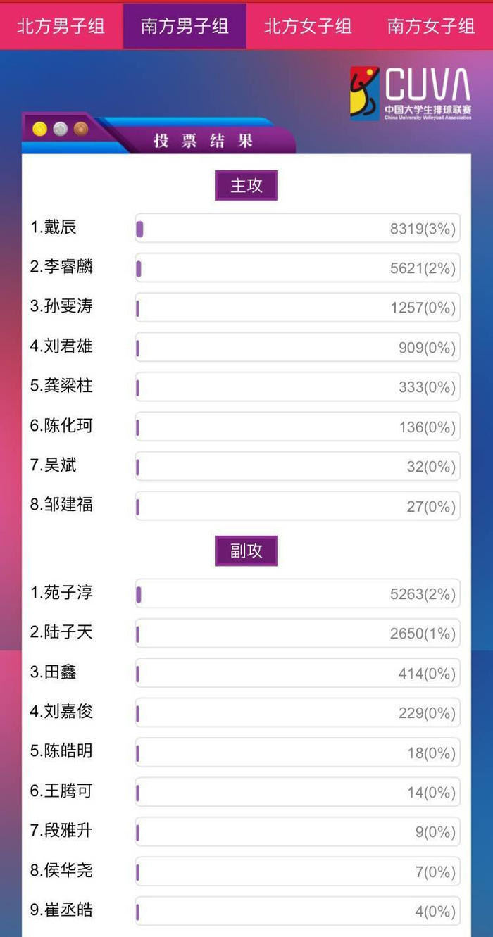 南方赛区男子组主攻榜,湖南师范大学队长戴辰以8319票排名第一,中南大学李睿麟以5612票位列第二,湖南师范大学孙雯涛以1257票排名第三,位于第四的是来自西南政法大学的刘君雄。