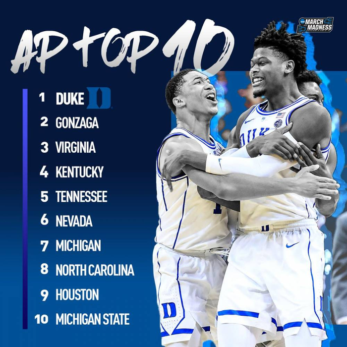 田纳西翻车之后,上周的二至四号种子全部向上攀升一名,蓝魔杜克也凭借稳固的九连胜重拾暌违已久的AP头名。上周面对路易斯维尔,杜克在最后10分钟还落后23分的情况下完成惊天逆转,在此之前,NCAA史上只有1993年的弗吉尼亚联邦大学在同时间点面对更大劣势(26分)完成过加时逆转。