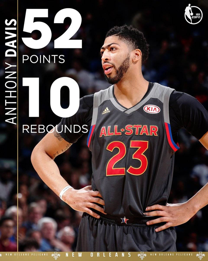 当时那年的全明星赛是在新奥尔良鹈鹕举行,浓眉哥作为东道主出战,队友也是接二连三为其做球,最终浓眉哥39投26中得到全场最高的52分10篮板,在率领西部以192-182力克东部。