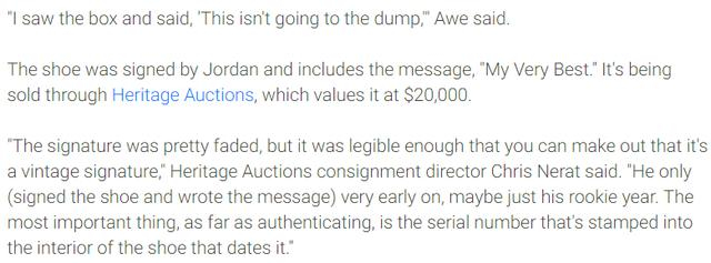 “签名有些褪色,但它足够清晰,你可以证明这是一个复古的签名,”Heritage Auctions的寄售总监克里斯·奈拉特说。“这是乔丹职业生涯早起的签名鞋和信条,也许是新秀赛季。最重要的是,就认证而言,它有印在鞋子内部的序列号。”