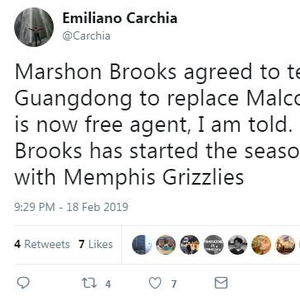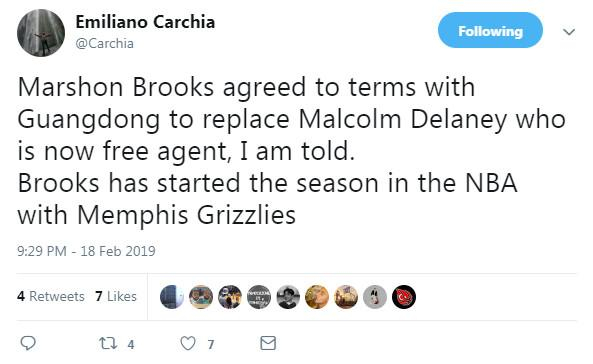 北京时间2月19日下午,外媒Sportando记者Emiliano Carchia在推特爆料:马尚-布鲁克斯已同意加盟广东男篮,取代原广东男篮小外援德莱尼。