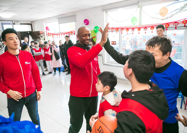 来到康复中心布置的活动场地,特里通过简单的传球动作很快和孩子们熟悉起来,肢体上的障碍不能阻挡孩子们对篮球的热情,胸前传球、击地传球,他们都努力克服困难去完成,每抛出一个好球都开心不已。