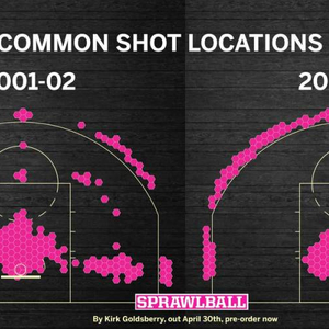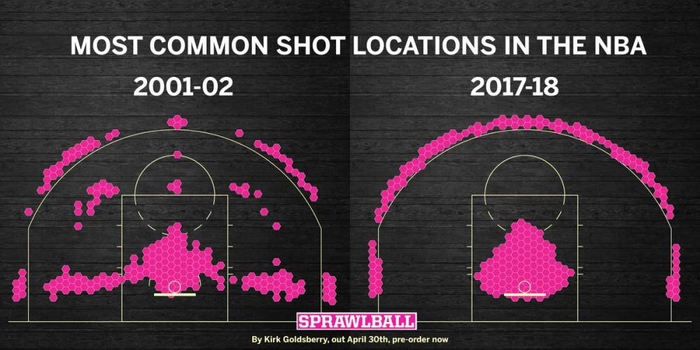 Kirk对比了2001-2002赛季和2017-18赛季球员常用投篮点,从图中不难发现,现如今魔球理论盛行的时代,球员的惯用投篮点都集中分布在了三分线和内线三秒区中,而在2001-02赛季,投篮点在三分线以及三分线内还处于多点开花的状态。