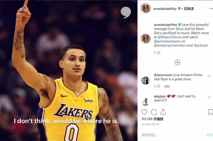 阿什利也有在关注NBA,曾经在个人ins里晒了一段湖人球员库兹马和他母亲的视频,点赞库兹马。