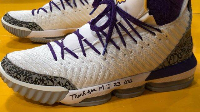 詹姆斯穿的球鞋上写了一句话:“感谢你,迈克尔-乔丹。”