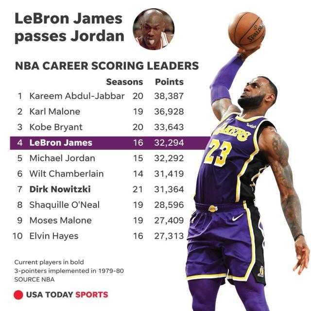 湖人与掘金的比赛正在进行中,詹姆斯在本场比赛中职业生涯总分超越迈克尔-乔丹,升至历史第四。