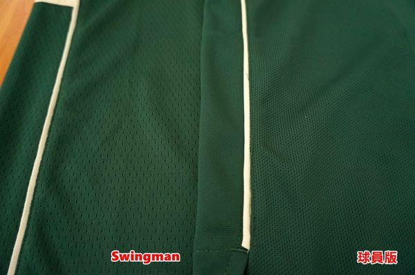 首先,简单说明何谓 Swingman 和球员版球衣: Swingman 球衣就是一般市面上最广泛可见的等级,以热黏贴方式呈现字体,球衣上部分细节被省略;而球员版顾名思义就是仿照 NBA 球员实际在球场上穿著的球衣去製作,布料材质和字体製作方式以及球衣细节都和球员实际比赛穿著的球衣相当接近,订价也相对于 Swingman 高昂。版型