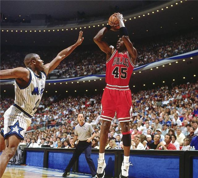 随后,由于拥有乔丹,公牛队重返季后赛半决赛舞台,对手正是奥尼尔和哈达威领衔的魔术队。当时第一场比赛还剩下18秒,公牛队还领先1分,而此时球权还在公牛队手上,那个掌握着皮球的,正是界上最好的球员——迈克尔-乔丹。然而,之后却发生了历史上无法忘记的一幕:乔丹运球进攻,篮球之神的注意力都放在了前面,而忘了后有追兵,魔术队的菜鸟球员尼克-安德森迅速把乔丹手上的皮球捅走,偏偏又是公牛队前队员霍里-格兰特拿到了皮球,出手,致命一击,魔术队绝杀公牛!