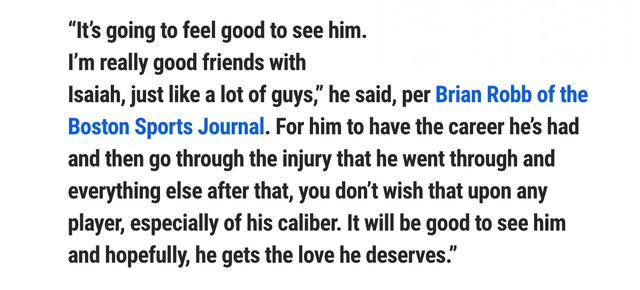 “见到他会感觉很好。我和以赛亚真的是好朋友,就像很多人一样。”对他来说,拥有自己的职业生涯,然后经历伤病,以及之后的一切,你不会希望任何球员都是这样,尤其是像他这样的水平。很高兴见到他,希望他能得到他应得的爱。”
