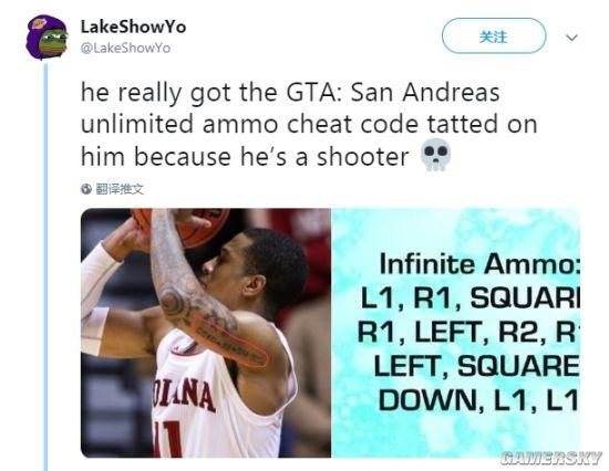 美国很多篮球明星都喜欢纹身,这些有趣古怪或者严肃的图案,对他们而言具有很深的含义。最近,推特网友LakeShowYo发现效力于印第安纳大学山地人男子篮球队的德文特·格林,居然在自己身上纹了《GTA:SA》的游戏作弊码,非常有趣。