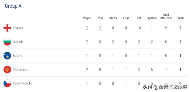 欧洲杯预选赛A组积分榜:英格兰两连胜登榜首,捷克0分排名垫底!