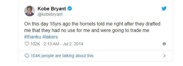 在1996年,夏洛特黄蜂队在选秀大会上就选择了布莱恩特。年仅18岁,一位来自高中的年轻运动员。科比并没有代表黄蜂队队打过任何一场比赛,就立即被交易到湖人队以换取弗拉德·迪瓦茨。之后的故事大家都知道了,科比最终帮助湖人赢得了五次总冠军。他成为18次全明星,奥运会金牌得主,当然还是篮球史上最伟大的球员之一。20年来,科比一直是湖人队的代言人。