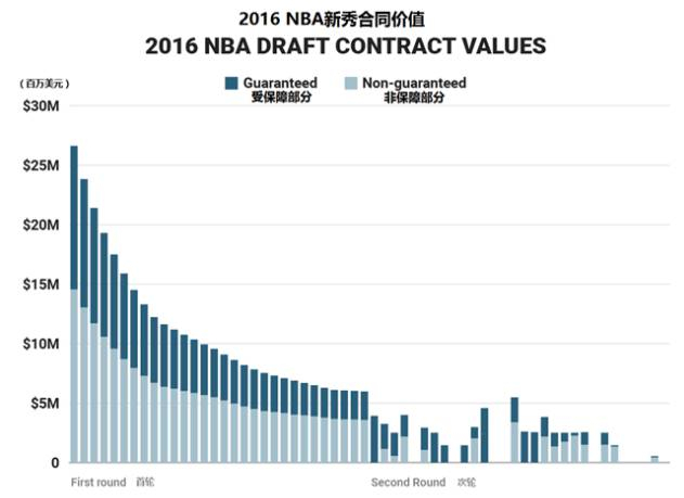 下边这张统计图为2016年NBA新秀合同的统计,不同顺位的新秀签下的合同薪资差距明显,如果球员顺位跌入次轮,只能签价值更小、年限更短的合同,受保障部分一般只有1-2年。